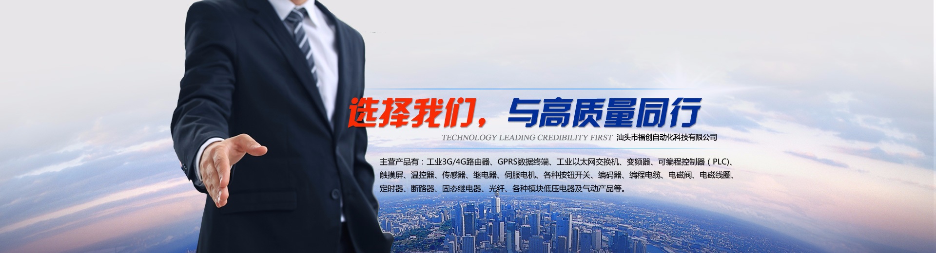 汕頭市福創(chuàng)自動化科技有限公司是一家集自動化元件的代理銷售與維修、自動化設備設計制造、自動化工程安裝改造、機電工程安裝改造、自動化機械設備設計與制造的企業(yè)?! ≈鳡I產品有:工業(yè)3G/4G路由器、GPRS數據終端、工業(yè)以太網交換機、變頻器、可編程控制器(PLC)、觸摸屏、溫控器、傳感器、繼電器、伺服電機、各種按鈕開關、編碼器、編程電纜、電磁閥、電磁線圈、定時器、斷路器、固態(tài)繼電器、光纖、各種模塊低壓電器及氣動產品等。